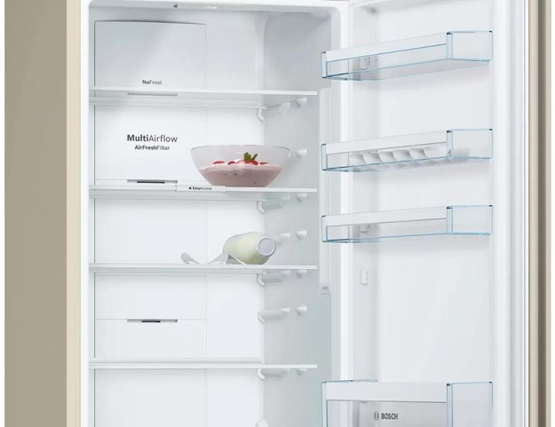 Bosch KGN39VK21R — отдельностоящий холодильник в элегантном бежевом исполнении. При стандартных размерах — ширине 60 см и высоте 203 см — он очень вместителен. Общий объем его составляет 400 литров, а объем морозильной камеры — 110 литров. Для равномерного освещения внутреннего пространства предусмотрена продуманная светодиодная подсветка.