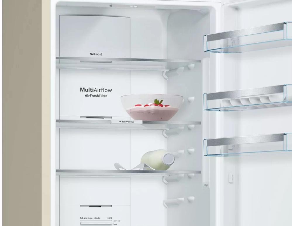 Охлаждение Multi AirFlow в холодильниках Bosch — многопоточная система, которая с помощью вентилятора распределяет холодный воздух по всему пространству холодильной камеры. Воздушные потоки достигают самых труднодоступных уголков, так что температура и влажность во всей камере выравнивается.