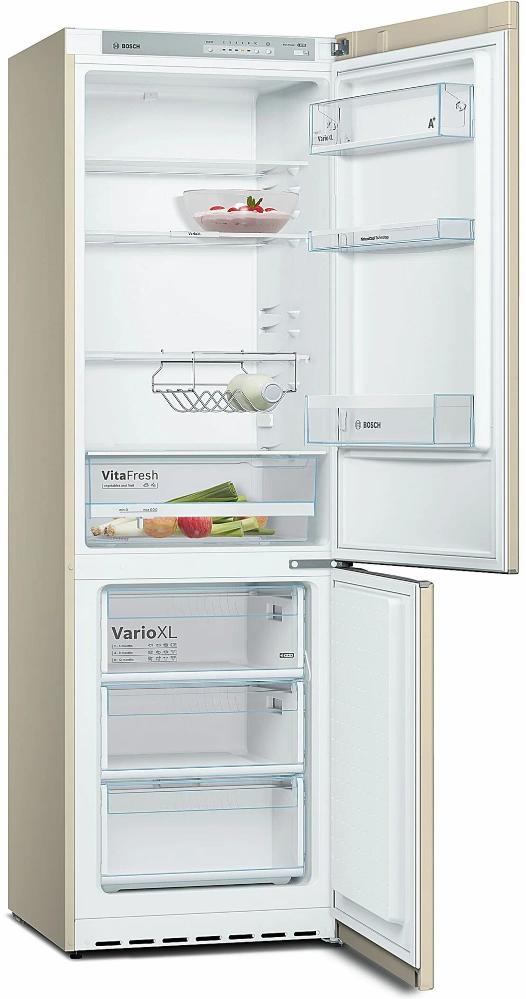 Bosch KGV36XK2AR — элегантная бежевая модель отдельностоящего типа установки. Холодильное отделение прибора работает по технологии NatureCool (охлаждения без циркуляции воздуха), благодаря которой продукты не пересушиваются и дольше остаются свежими. Уровень шума во время работы устройства составляет всего 38 дБ, что сопоставимо с разговором шепотом. Дверцу устройства можно перенавесить, а ножки отрегулировать по высоте, что облегчает его установку на кухне.