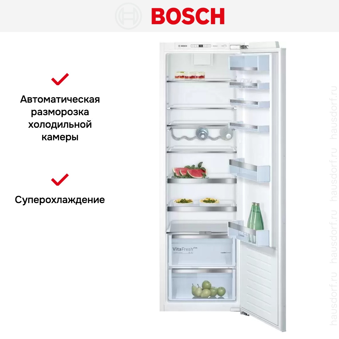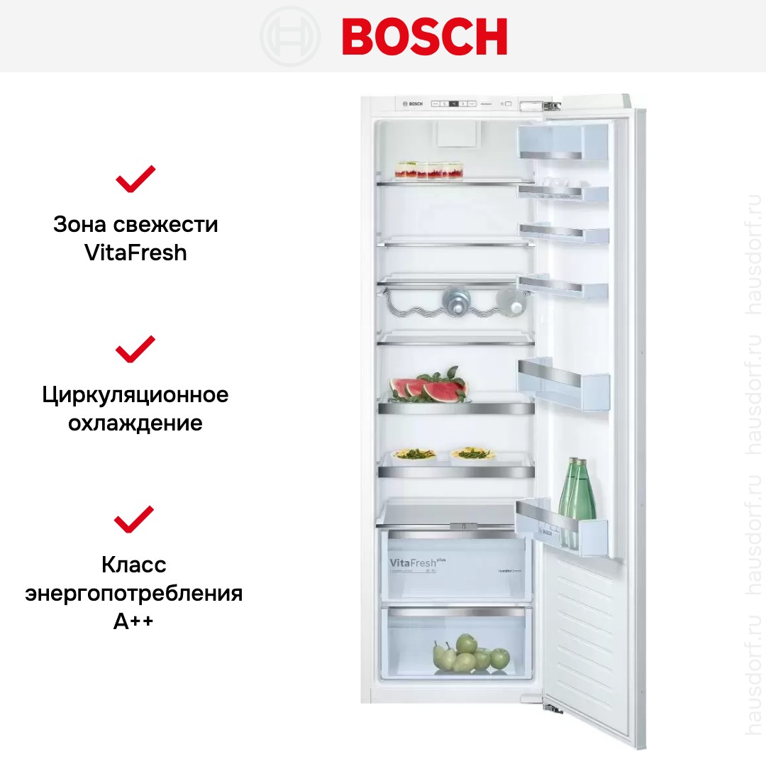 Bosch KIR81AF20R — встраиваемый холодильник из серии SmartCool. Оптимальный уровень влажности в контейнерах VitaFresh plus способствует сохранению всех полезных микроэлементов во фруктах и овощах. Дополнительный комфорт при интеграции устройства в готовый кухонный интерьер обеспечивается возможностью перенавешивания дверцы. Выдвижные полки EasyAccess с системой изменения высоты VarioShelf обеспечивают удобный доступ к содержимому. Технология VitaControl позволяет сохранять постоянный уровень температуры во всем отсеке. Эту модель без морозильника можно комбинировать с морозильными камерами того же производителя. О низком потреблении энергии свидетельствует класс энергопотребления A++.