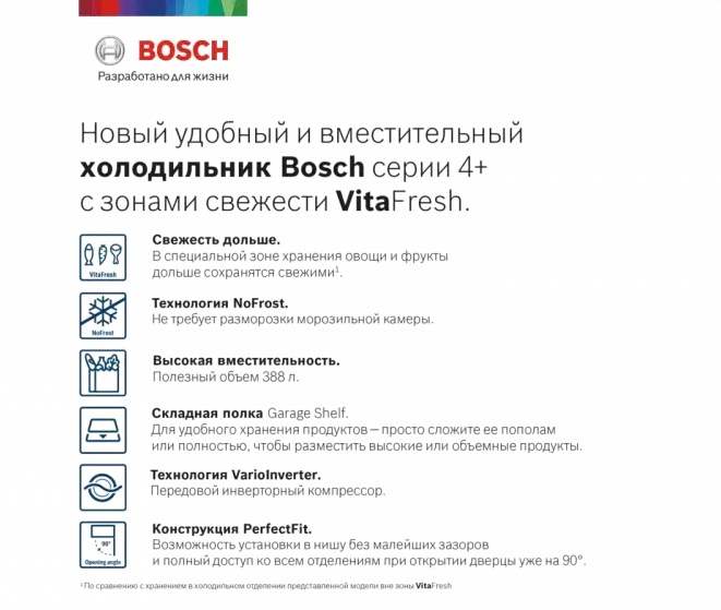 Зона свежести VitaFresh в холодильниках Bosch служит для увеличения срока хранения продуктов — от овощей и фруктов до свежего мяса и рыбы — без их заморозки. В ней поддерживается оптимальная температура около 0°C, а влажность в разных отделениях может регулироваться в зависимости от типа продуктов.