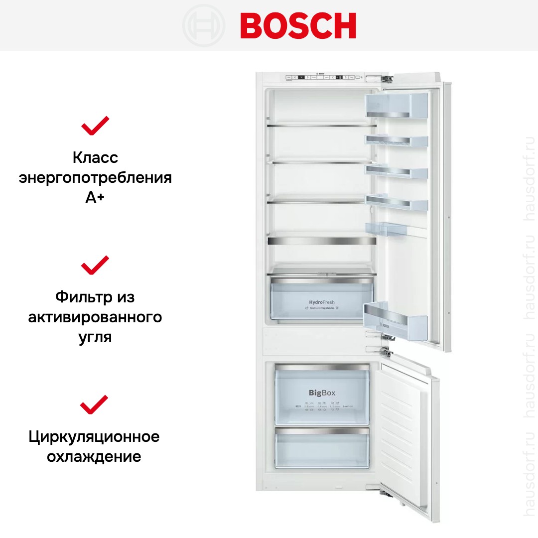 Встраиваемый холодильник Bosch KIS 87AF30 R — это элегантное и функциональное решение для современной кухни, сочетающее вместительность, инновационные технологии и безупречную интеграцию в интерьер. Модель обладает полезным объёмом 214 литров, включая 158 литров холодильного и 56 литров морозильного отделений, что обеспечивает достаточно места для ежедневных продуктов, свежих овощей, напитков и замороженных запасов. Благодаря технологии NoFrost в морозильной камере полностью исключено образование инея, что избавляет от необходимости ручной разморозки и поддерживает стабильный микроклимат.
