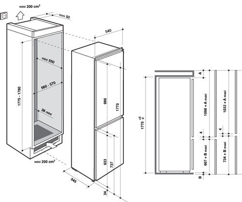 Встраиваемые холодильники монтируются в нишу или колонну. Передняя их часть закрывается декоративным мебельным фасадом и снаружи не отличается от дверцы обычного кухонного шкафа, так что их не нужно подбирать под интерьер помещения. Объем этих холодильников, как правило, несколько меньше, чем у отдельностоящих, так как при встраивании необходимо оставлять свободное пространство для вентиляции. Они отличаются меньшим уровнем шума, а также лучше держат холод и отличаются большей экономичностью из-за дополнительного слоя изоляции. Ассортимент этих холодильников не так велик, как у отдельно стоящих, установка более трудоемкая, а стоимость обычно несколько выше.
