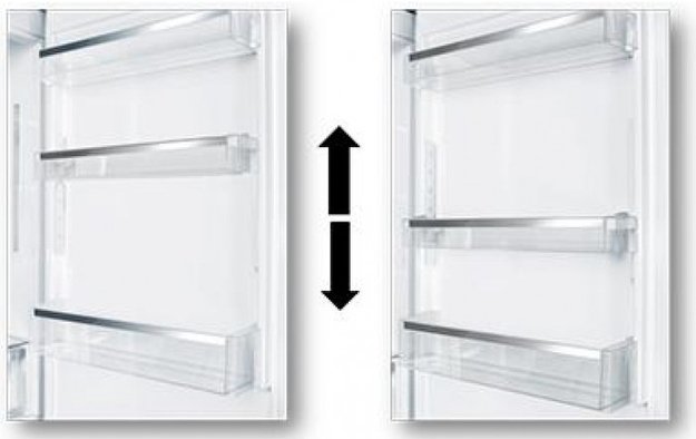 Подобная конструкция достаточно сложна, а кроме того, между наружной и внутренней дверями остается небольшой зазор, в котором со временем может накапливаться пыль и грязь, что ведет к преждевременному изнашиванию механизма. В подобных холодильниках не рекомендуется сильно нагружать дверные полки, чтобы дверца из-за этого не могла просесть. Достоинством системы Door Sliding является более широкий выбор материалов декоративных фасадов: поскольку наружная дверца опирается на собственные петли, вес ее может быть значительным.