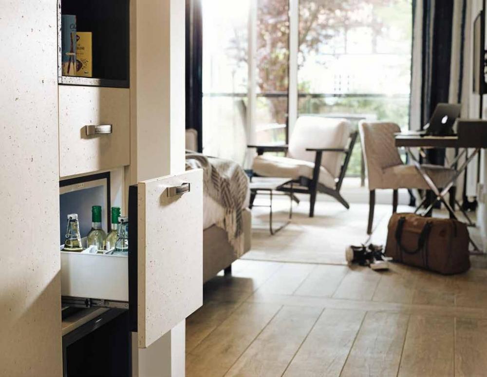 Как правило, объем подобного мини-холодильника не превышает 50-70 литров. Он имеет одну дверцу, за которой размещаются две или три полки в основной камере, полки на дверце для хранения бутылок и иногда небольшая верхняя морозильная камера с контейнером для льда. Мини-бар может встраиваться в тумбу стола или в шкаф за декоративным мебельным фасадом; в некоторых случаях подобное устройство устанавливается под столешницей и может иметь прозрачную дверцу.