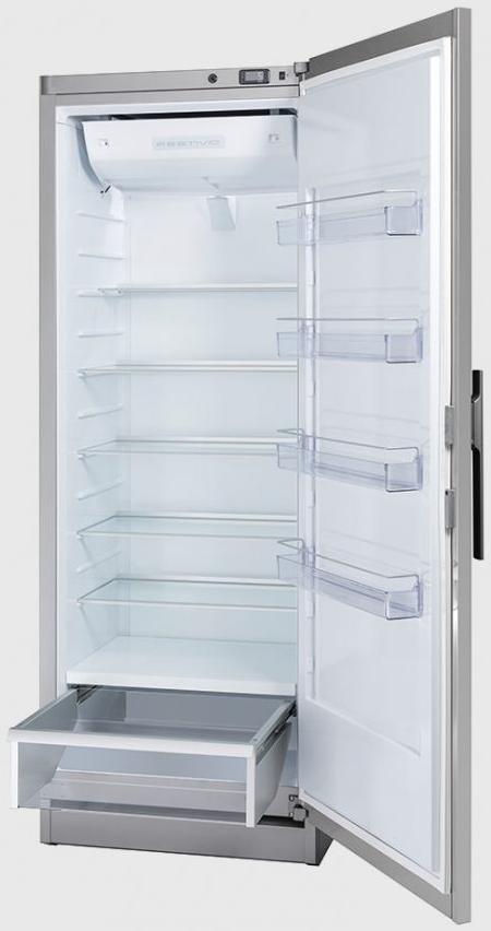 Холодильная камера выполнена в цветовом сочетании серого и нержавеющей стали, который подойдет дизайну большинства кухонь. Дисплей с индикацией температуры расположен вверху за дверью — удобно контролировать работу прибора.