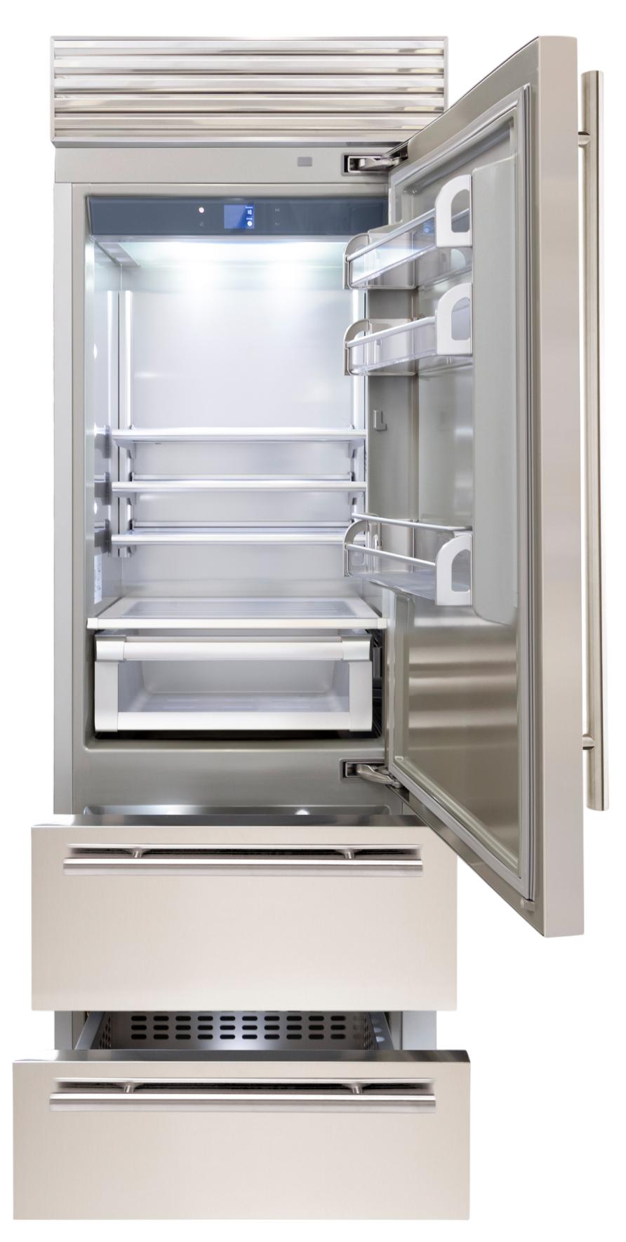 Трехкамерные модели выпускаются в нескольких вариантах. В некоторых случаях в качестве третьей камеры поступает так называемая зона свежести — отделение, где поддерживается температура около 0 градусов. В другом варианте подобные модели имеют морозильную камеру, состоящую из двух выдвижных ящиков.