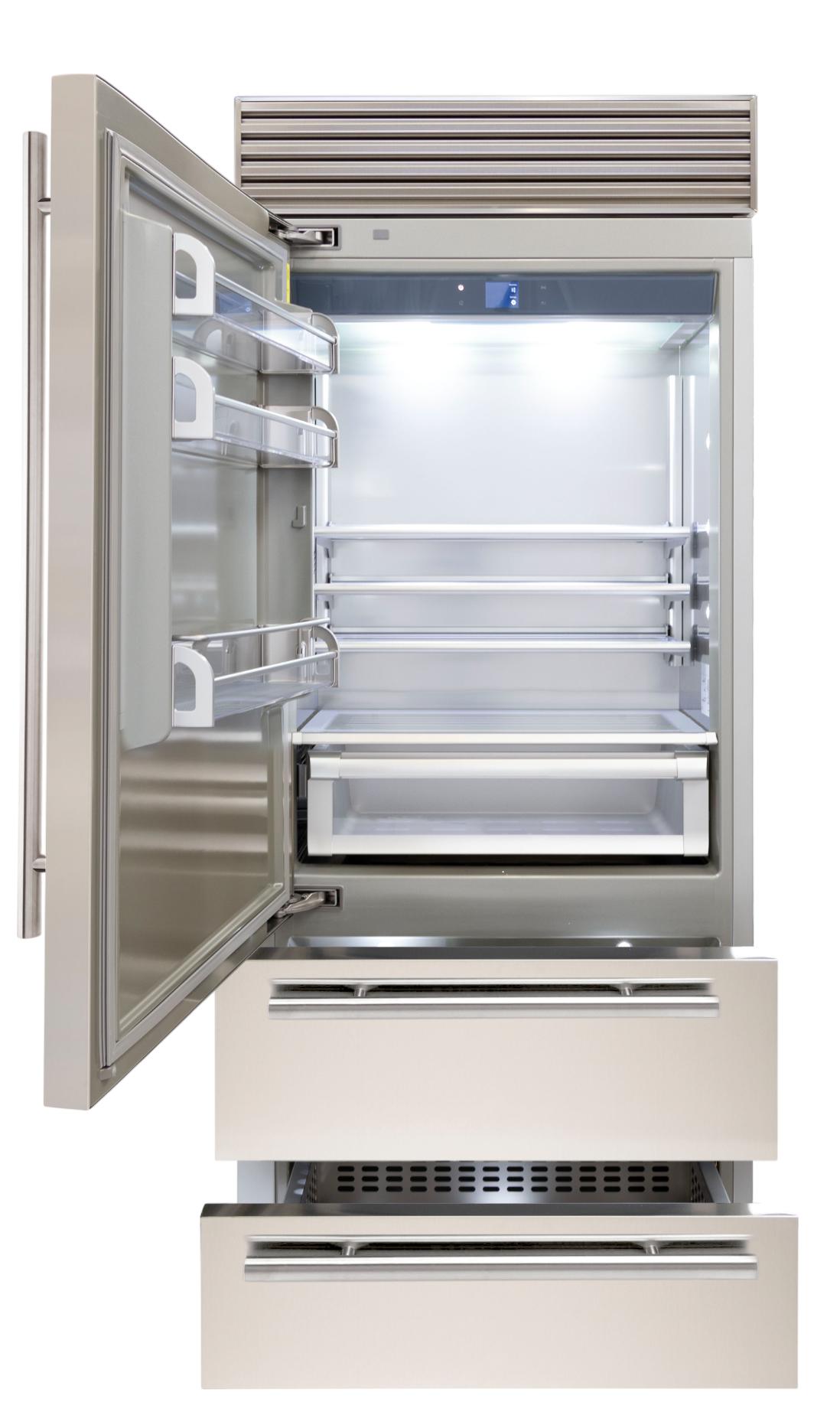 Трехкамерные модели выпускаются в нескольких вариантах. В некоторых случаях в качестве третьей камеры поступает так называемая зона свежести — отделение, где поддерживается температура около 0 градусов. В другом варианте подобные модели имеют морозильную камеру, состоящую из двух выдвижных ящиков.