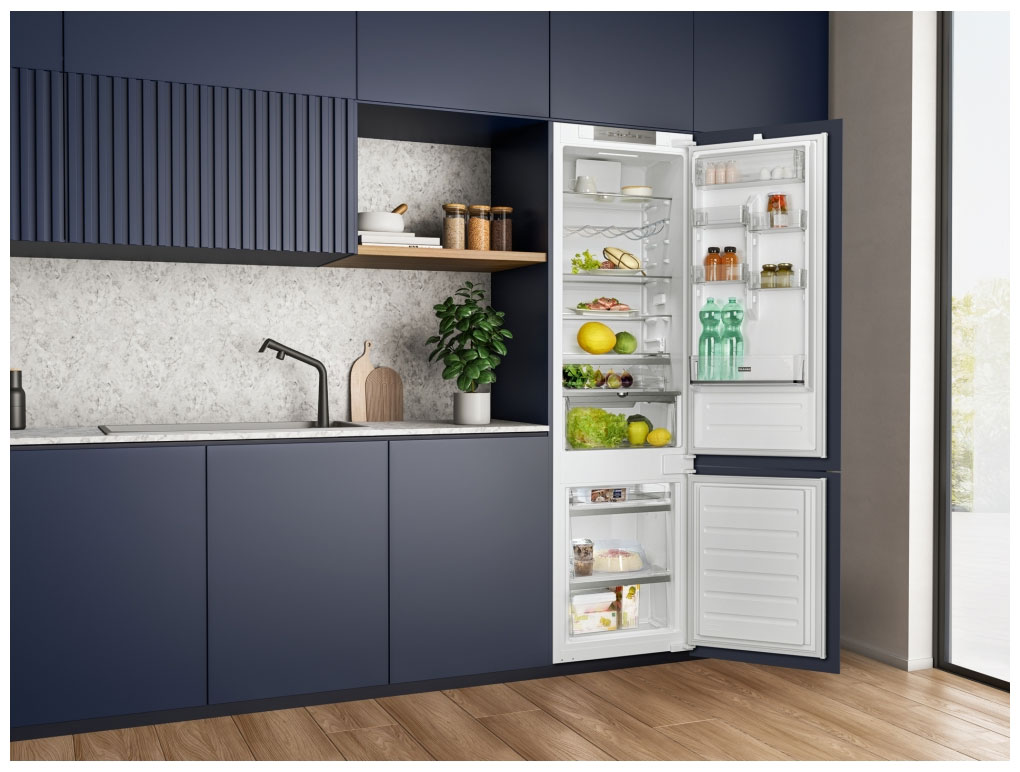 Встраиваемый прибор проще разместить в комнате, даже если общий метраж не такой уж большой. Вы можете спрятать его за декоративной панелью от мебельного фасада — советуем заранее определить нишу и заказывать панели исходя из типа крепления к двери. Способ монтажа в данной модели: скользящее крепление двери (система door sliding) Благодаря внушительным размерам, в частности высоте, она подходит большим пространствам — просторной кухне, еврогостиной. Вы можете поменять направление открывания двери, так как упор переставляемый и ее можно перевесить на другую сторону. Такая функция открывает больше возможностей для установки. Холодильник с морозильником обладает всеми опциями, которые чаще всего ищут и выбирают покупатели. Стандартная конфигурация — универсальный вариант для любой квартиры. Количество камер: 2.