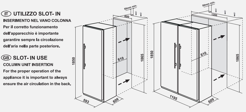 Во встраиваемых моделях имеется специально организованная система вентиляции, не позволяющая им перегреваться при установке в шкаф-пенал или нишу. Нередко в них имеется вентиляционная база с решеткой в цоколе: она выдерживает достаточные нагрузки и позволяет обеспечить необходимый уровень вентиляции. Системы внутренней вентиляции призваны равномерно распределять охлажденный воздух по всему объему камеры и поддерживать естественную влажность. Для моделей с системой размораживания No Frost предусмотрена принудительная вентиляция, которая предусматривает движение воздуха через испаритель.
