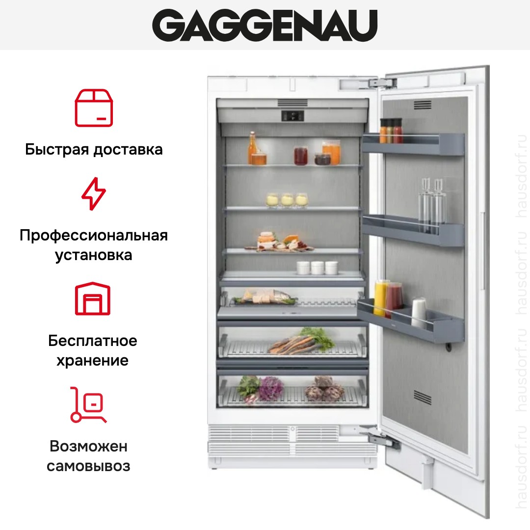 Встраиваемый холодильник Gaggenau RC492305 представляет собой образец продуманного дизайна и инженерии, созданный для тех, кто ценит строгие очертания и функциональную роскошь в интерьере кухни. Высота 212 см, ширина 90 см и глубина 60 см делают аппарат внушительным по вместимости при аккуратной интеграции в мебельную нишу 213.4×91.4×61 см. Цветная панель под навес вашего фасада обеспечивает идеальное сочетание с любым обликом. Корпус из металла гарантирует долговечность, а жесткое крепление двери в системе door on door вместе с техникой плоских шарниров и возможностью перевешивания обеспечивают ровную линию фасада и угол открытия 115° для удобного доступа.