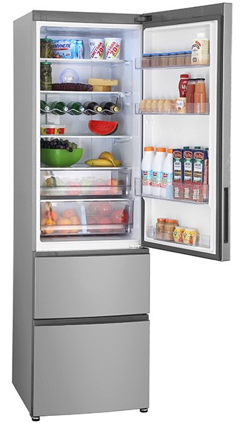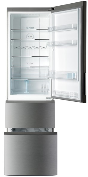 Haier A2F637CXMV — отдельностоящий холодильник в цвете нержавеющей стали. Он без труда поместится в малогабаритной кухне благодаря стандартной ширине 60 см. Общий объем 378 литров рассчитан на хранение значительного запаса продуктов. Объем морозильной камеры, состоящей из двух вместительных выдвижных ящиков, составляет 100 литров. Панель управления с ЖК-дисплеем расположена на фасаде, так что регулировка температуры производится при закрытой дверце.
