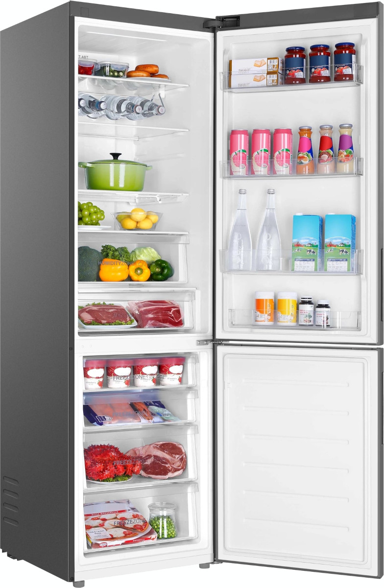 Данная модель — отдельностоящая, поэтому нужно тщательно подобрать место для ее размещения. Благодаря внушительным размерам, в частности высоте, она подходит большим пространствам — просторной кухне, еврогостиной. Вы можете поменять направление открывания двери, так как упор переставляемый и ее можно перевесить на другую сторону. Такая функция открывает больше возможностей для установки. Холодильник с морозильником обладает всеми опциями, которые чаще всего ищут и выбирают покупатели. Стандартная конфигурация — универсальный вариант для любой квартиры. Количество камер: 2.