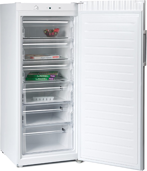 Отдельностоящий морозильник с 6 прозрачными ящиками: 3 выдвигаются, 3 закрываются крышкой. Модель обладает классическим дизайном, поэтому сможет стать прекрасным дополнением любого кухонного гарнитура. Также в комплекте есть лоток для льда. Прибор замораживает за одни сутки до 13 кг, поэтому загружать продукты нужно партиями. Обозначение **** соответствует минимальному уровню температуры −24°С. В устройстве применяется наиболее надежный принцип прямого охлаждения. Управление осуществляется при помощи удобного механического поворотного регулятора. Низкий уровень шума 40 дБ способствует комфортной эксплуатации. Гарантия производителя на эту морозильную камеру составляет 36 месяцев.
