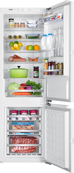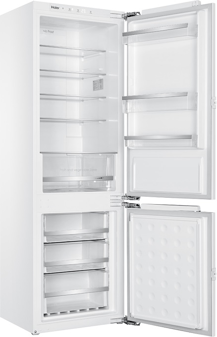 Холодильник Haier BCFT628AWRU встраиваемого типа, оснащенный системой NoFrost. Полки защищены от проливания специальными бортиками. Камера предлагает 179 литров полезного объема. Разместите продукты на 5 основных полках, воспользуйтесь 2 ящиками и дополнительными полочками на дверце. Морозилка предотвращает намерзание льда и при этом эффективно и равномерно охлаждает содержимое. Дополнительный режим «Отпуск» с уменьшенным потреблением энергии предотвратит появление неприятных запахов, пока вы в отъезде, при этом не придется переплачивать за технику, работающую вхолостую.