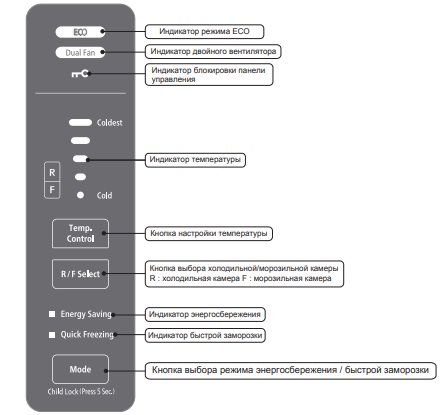 Элементы управления на панели холодильника предназначаются в первую очередь для регулировки температуры в камерах, а также для задания дополнительных параметров работы.