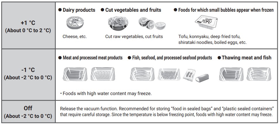 В некоторых подобных устройствах, например, в холодильниках Hitachi, выделяется отделение с технологией вакуумирования продуктов, увеличивающей срок их хранения, а также отдельный герметичный отсек для хранения овощей со специальной технологии поддержания свежести и контролем влажности.