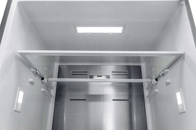 No Frost (Total No Frost, Frost Free): вентилятор обеспечивает циркуляцию охлажденного воздуха, благодаря чему лед не нарастает на стенке, а концентрируется только на скрытом внутри холодильника испарителе. Талая вода собирается в специальной емкости и испаряется. Такой холодильник не нужно размораживать – это экономит время и позволяет не останавливать прибор. Благодаря этим плюсам в современных моделях No Frost – самая распространенная система.