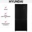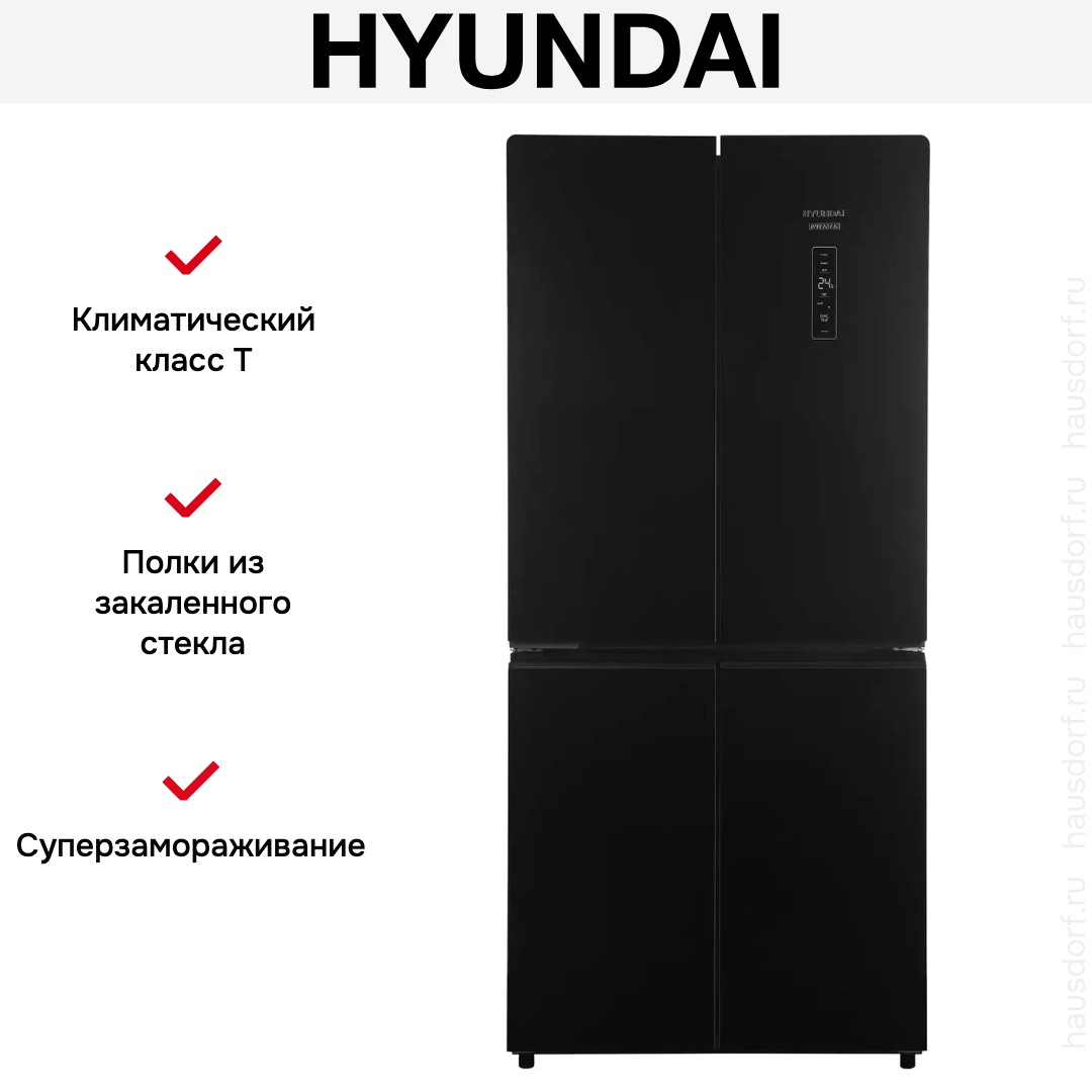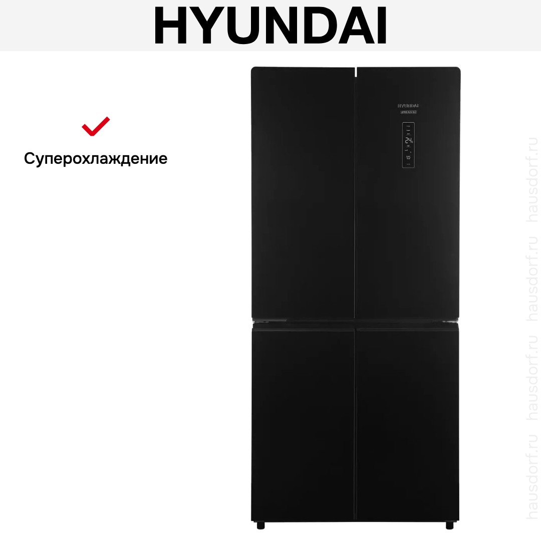 Холодильник HYUNDAI CM45083F — отдельностоящая модель формата FrenchDoor с четырьмя дверцами. Корпус черного цвета с гладкой фронтальной панелью из стекла выглядит строго и лаконично; скрытые ручки поддерживают цельный вид фасада. На одной из дверей расположен информативный дисплей: сенсорные кнопки и электронная система управления позволяют быстро задать нужные параметры. При габаритах 185,5×83×65 см техника органично вписывается в просторную кухню, а нижняя морозильная камера упрощает ежедневный доступ к свежим продуктам. Общий объем достигает 485 л, при этом полезная емкость — 433 л: места хватит на крупные покупки и заготовки.