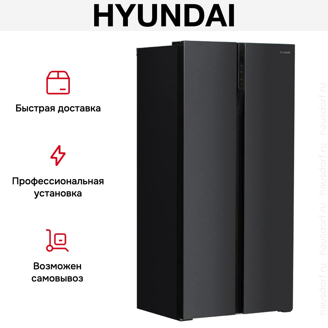 Выглядит представительно: высокий отдельностоящий Side-by-Side холодильник с фронтом из металла черного цвета и скрытой ручкой. Две плотно сочетающиеся дверцы при угле открывания до 149° обеспечивают удобный доступ, а размеры 178×83.6×63.6 см дают представление о внушительной габаритности прибора.