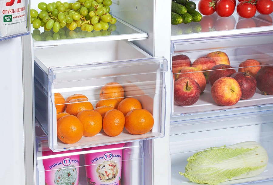 Вместительные контейнеры позволяют хранить достаточное количество овощей и фруктов. Для более длительного хранения и поддержания свежести овощей и фруктов разработаны специальные системы хранения. Среди них, например, зона свежести с увеличенной влажностью до 85% и температурой около 0 градусов. Это герметично закрывающийся ящик, часто на выдвижных роликах или направляющих, в котором имеется специальное задвижка, позволяющая регулировать влажность. Как известно, при более высокой влажности продукты с большим содержанием воды дольше остаются свежими.