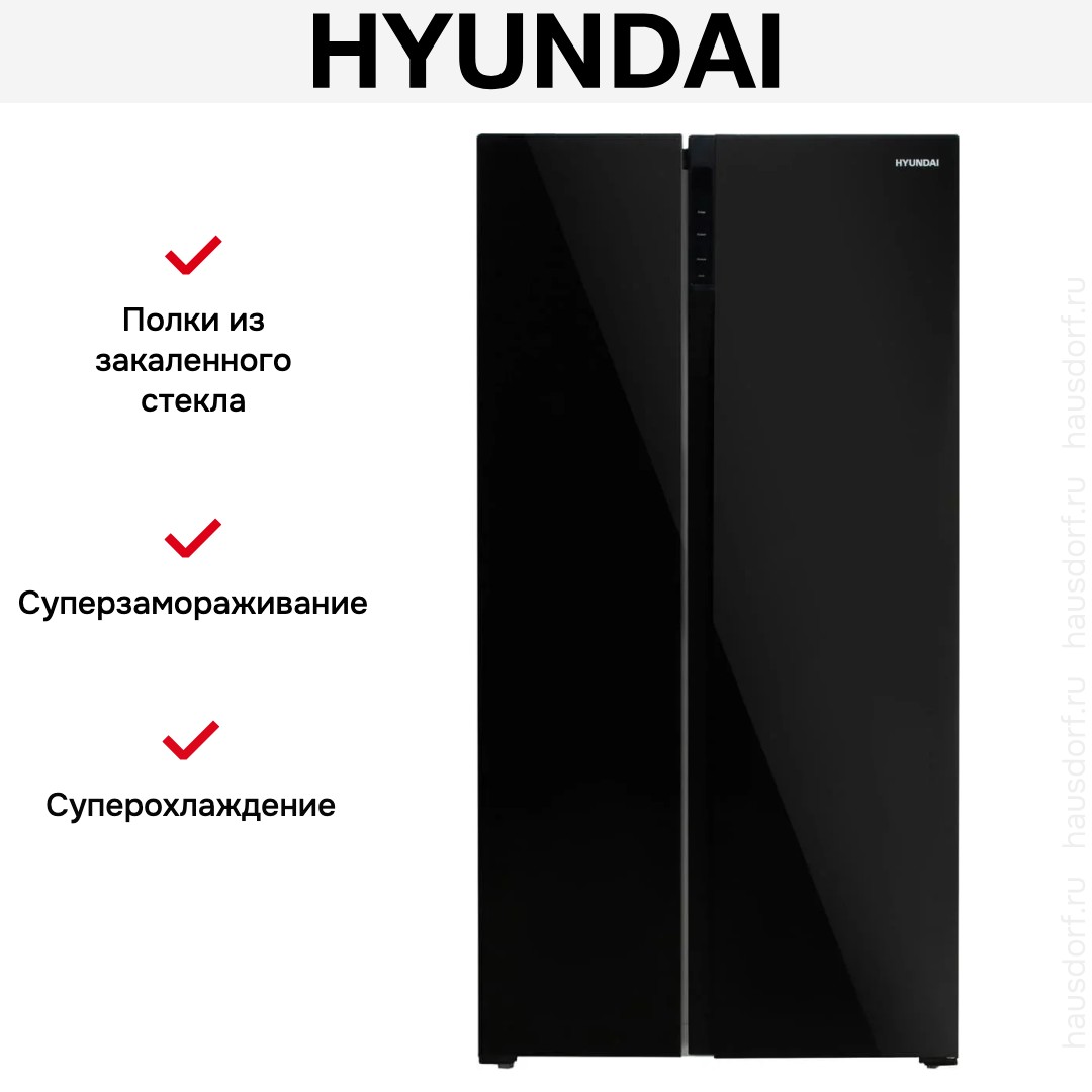 Холодильник Hyundai CS5003F — современный отдельно стоящий Side-by-Side в черном стекле, сочетающий простор и элегантность. Его габариты 178×91.1×63.6 см делают прибор заметным акцентом на кухне и одновременно вместительным решением для большой семьи.