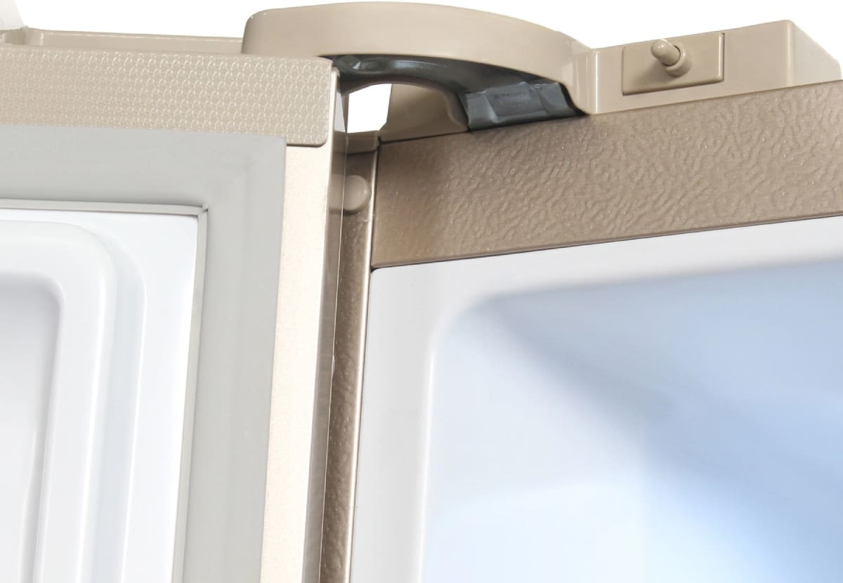 Очень редко в холодильниках можно увидеть откидную дверцу — она имеется, например, в отсеке для вакуумирования в холодильниках Hitachi.