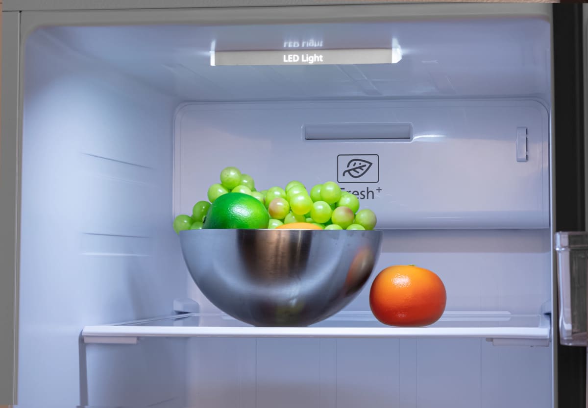 Специальная зона свежести предназначена для правильного и более длительного хранения овощей, фруктов, зелени. В ней поддерживается околонулевая температура, поэтому продукты не перемораживаются и не пересыхают.