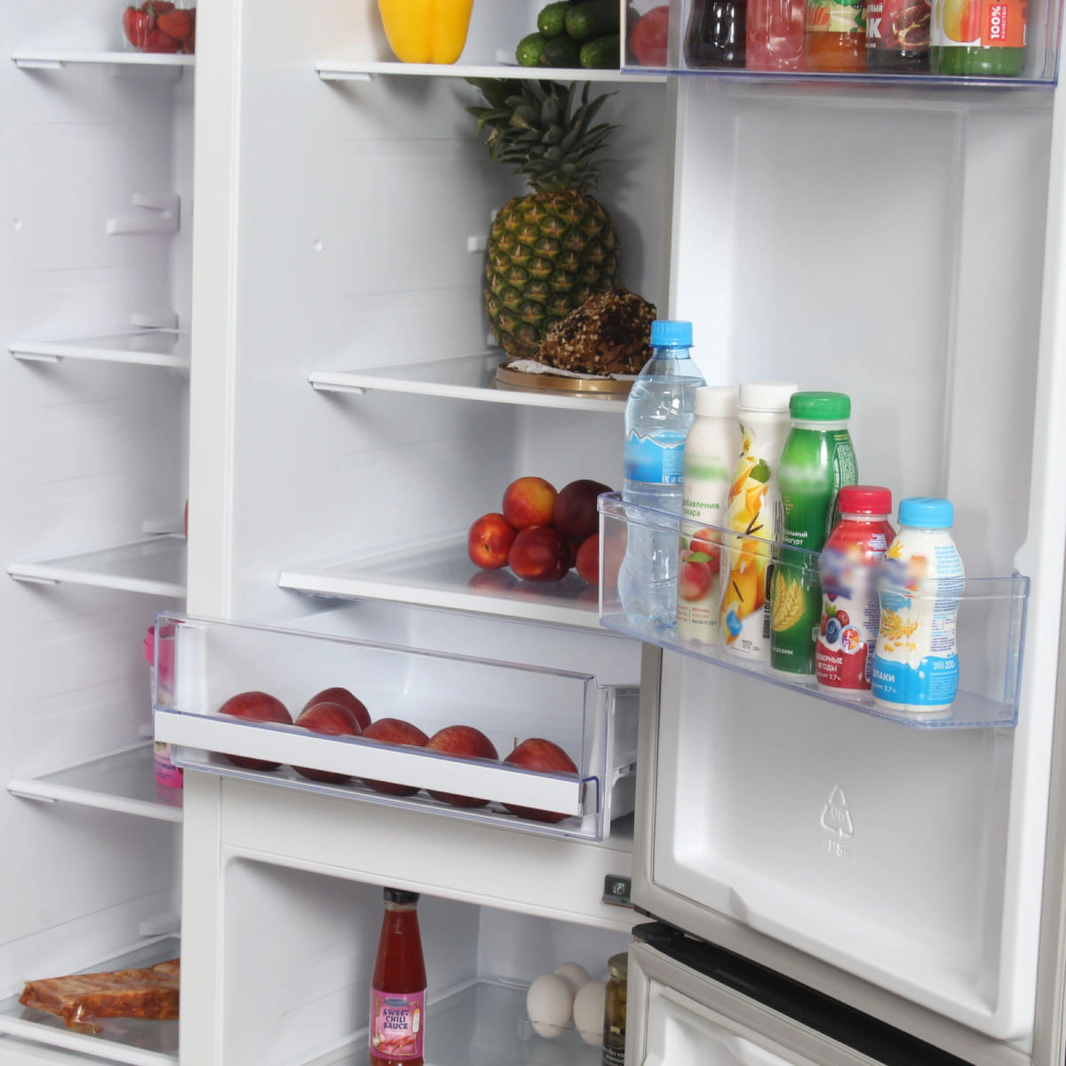 Полки в холодильнике позволяют рационально организовать хранение продуктов, обеспечить легкий поиск и доступ к ним. Основные материалы для изготовления полок — это пластик, стекло и металл. Часть полок можно переставлять по высоте или складывать вдвое или втрое.