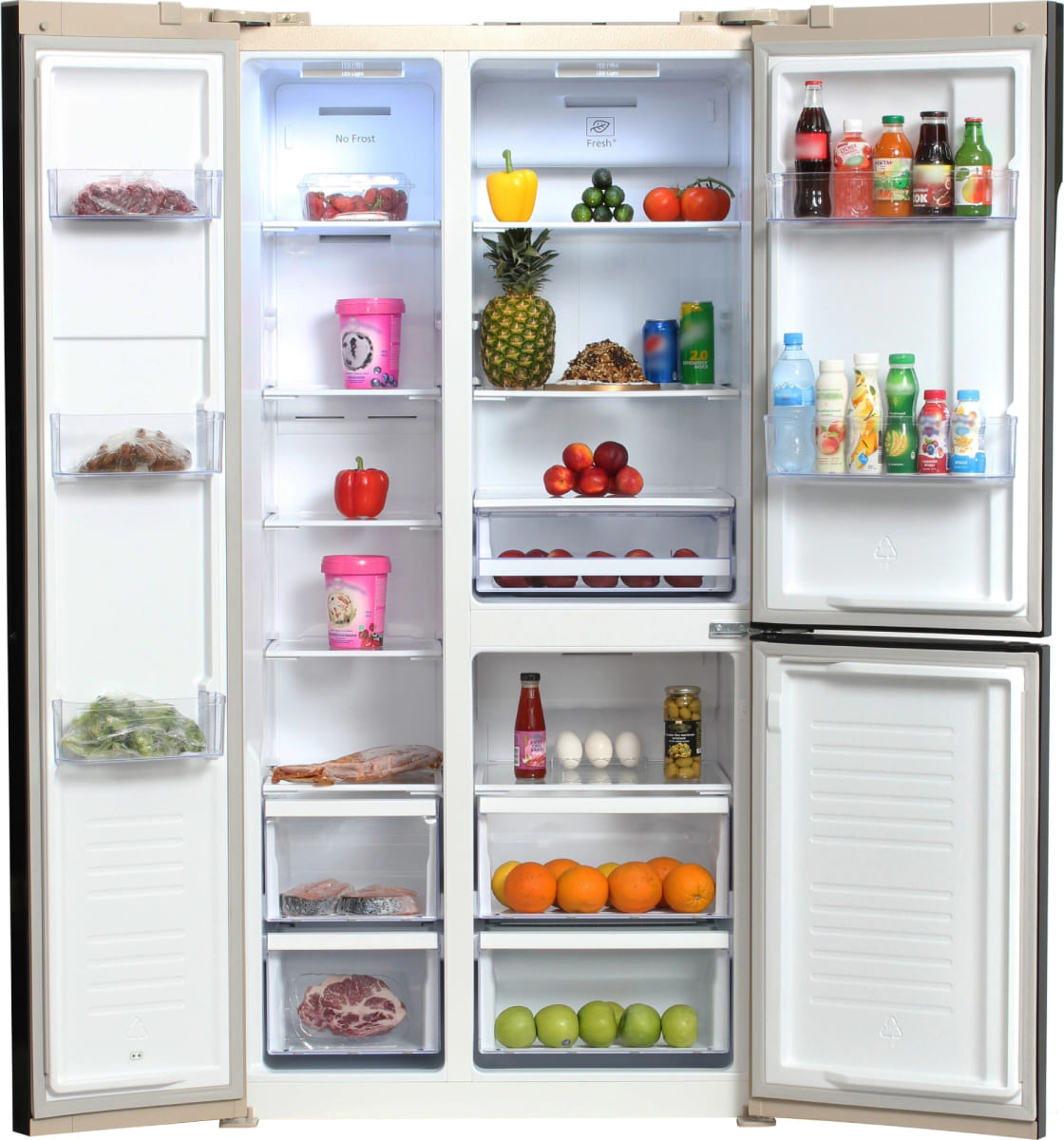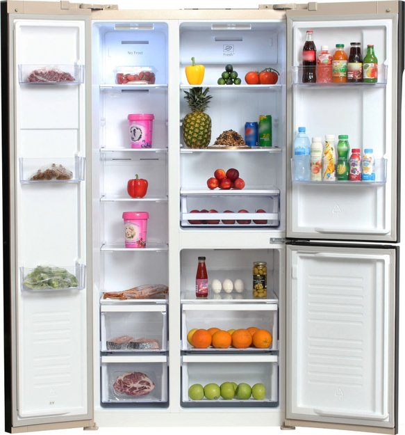 Холодильники Side-by-Side, что в переводе означает «бок-о-бок», — вместительные устройства, в которых холодильная и морозильная камеры располагаются рядом друг с другом. Они предназначаются для хранения значительного запаса продуктов и иногда называются холодильниками с американским типом компоновки, поскольку такие приборы с распашными дверями появились именно в США.