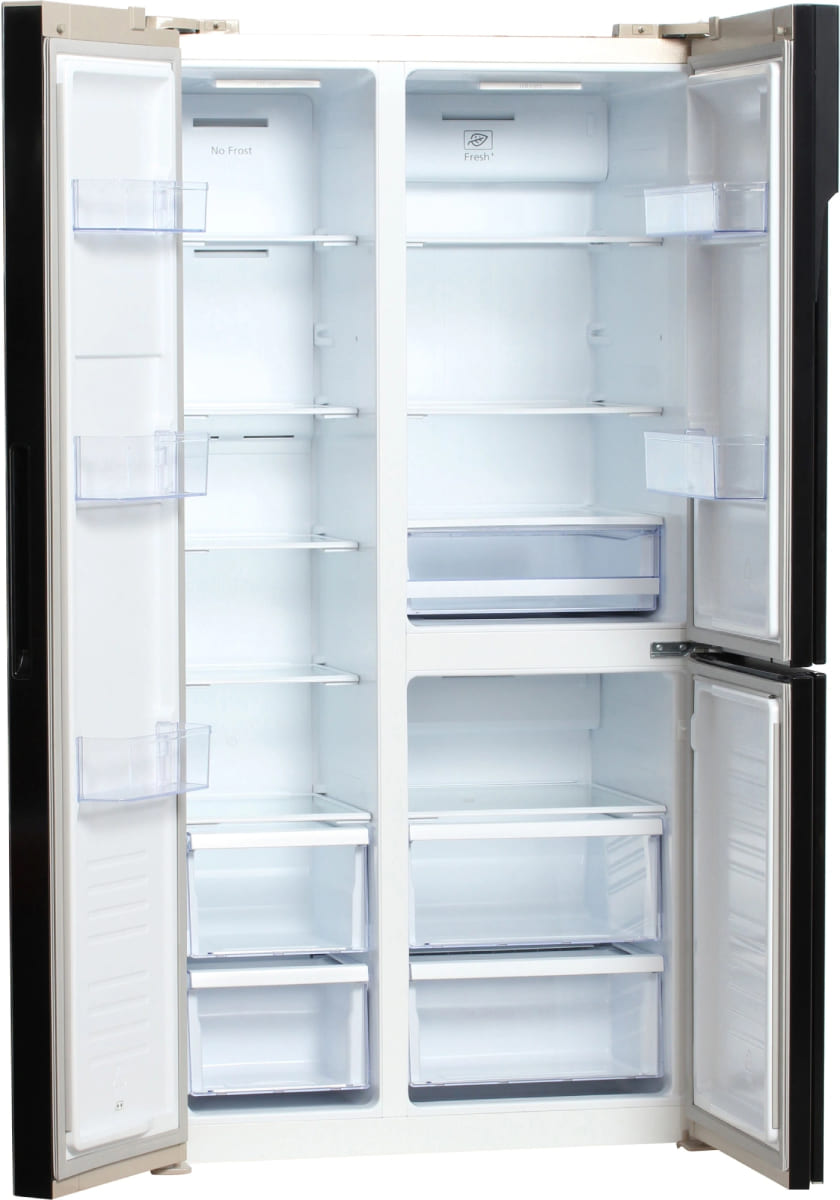 Данная модель — отдельностоящая, поэтому нужно тщательно подобрать место для ее размещения. Холодильник Side-by-Side с необычным расположением камер — сбоку друг от друга — позволяет увеличить объем продуктов для хранения. Такой вариант подходит обладателям просторной кухни, большим семьям, людям, которые запасают продукты и готовят впрок. Количество камер: 3.