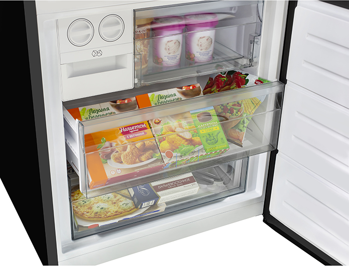 Трехкамерные модели выпускаются в нескольких вариантах. В некоторых случаях в качестве третьей камеры поступает так называемая зона свежести — отделение, где поддерживается температура около 0 градусов. В другом варианте подобные модели имеют морозильную камеру, состоящую из двух выдвижных ящиков.