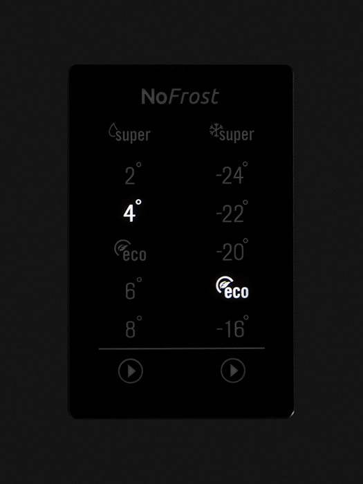 Гораздо точнее сориентироваться по индикаторам можно в холодильниках с электронной системой управления. Эти устройства обычно оснащены дисплеем, на котором высвечиваются значения фактической температуры в холодильной и морозильной камерах. Рядом с ними располагаются кнопки, во многих случаях сенсорные, при помощи которых можно регулировать температуру в каждой камере отдельно, и индикаторы включения этих камер. Здесь же, на панели инструментов, находятся индикаторы, указывающие на активацию дополнительных опций — например, режимов быстрого замораживания и быстрого охлаждения, отпускного режима, блокировки панели управления от детей.