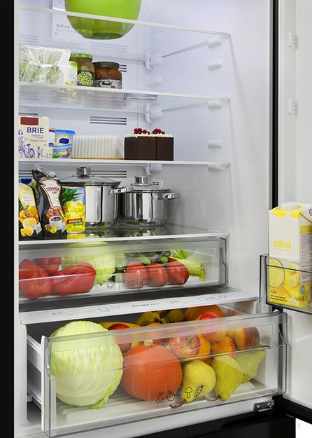 Вместительные контейнеры позволяют хранить достаточное количество овощей и фруктов. Для более длительного хранения и поддержания свежести овощей и фруктов разработаны специальные системы хранения. Среди них, например, зона свежести с увеличенной влажностью до 85% и температурой около 0 градусов. Это герметично закрывающийся ящик, часто на выдвижных роликах или направляющих, в котором имеется специальное задвижка, позволяющая регулировать влажность. Как известно, при более высокой влажности продукты с большим содержанием воды дольше остаются свежими.