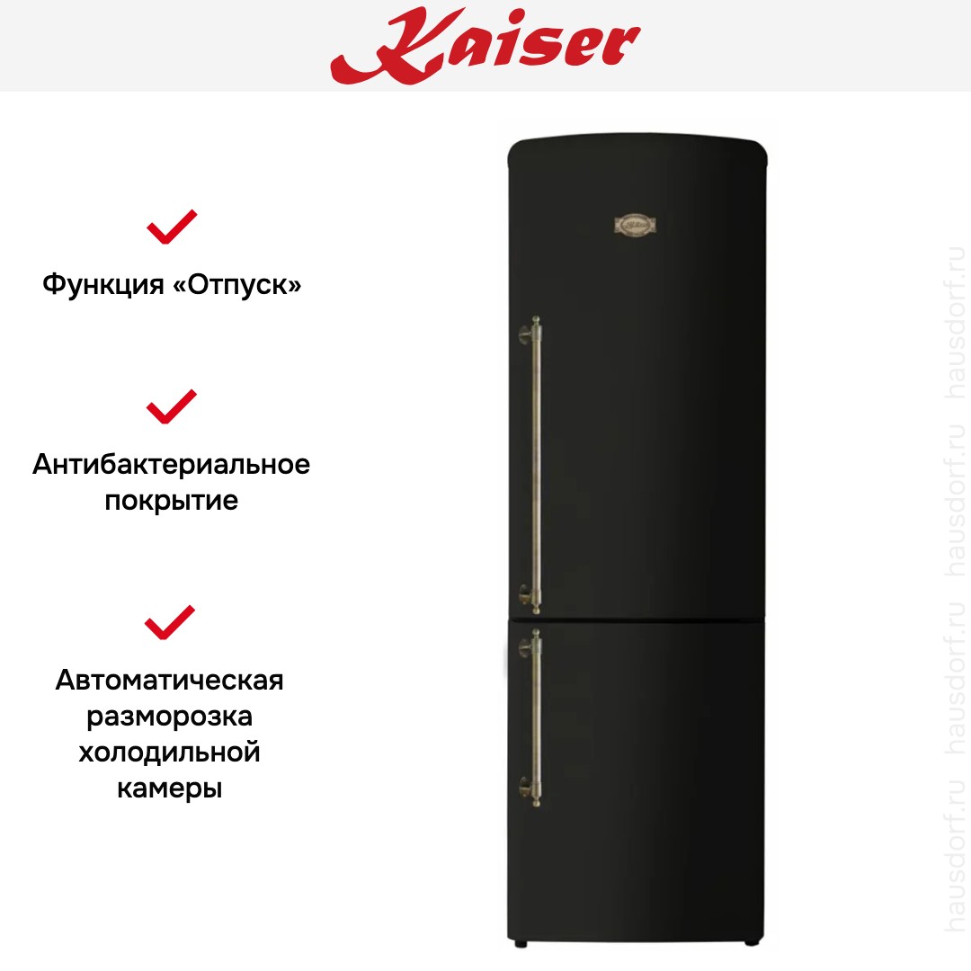 Холодильник Kaiser KK-60825 EM — отдельностоящий холодильник с морозильной камерой снизу, выполненный в строгом черном цвете с бронзовой фурнитурой и фронтом в едином стиле Empire. Его строгое, но благородное оформление впишется в современную и классическую кухню, а вертикальные накладные ручки обеспечивают удобный захват и добавляют образу солидности. При габаритах 199×72.5×60 см прибор занимает умеренное пространство и одновременно предлагает значительный внутренний объем, что делает его хорошим выбором для семейного использования.