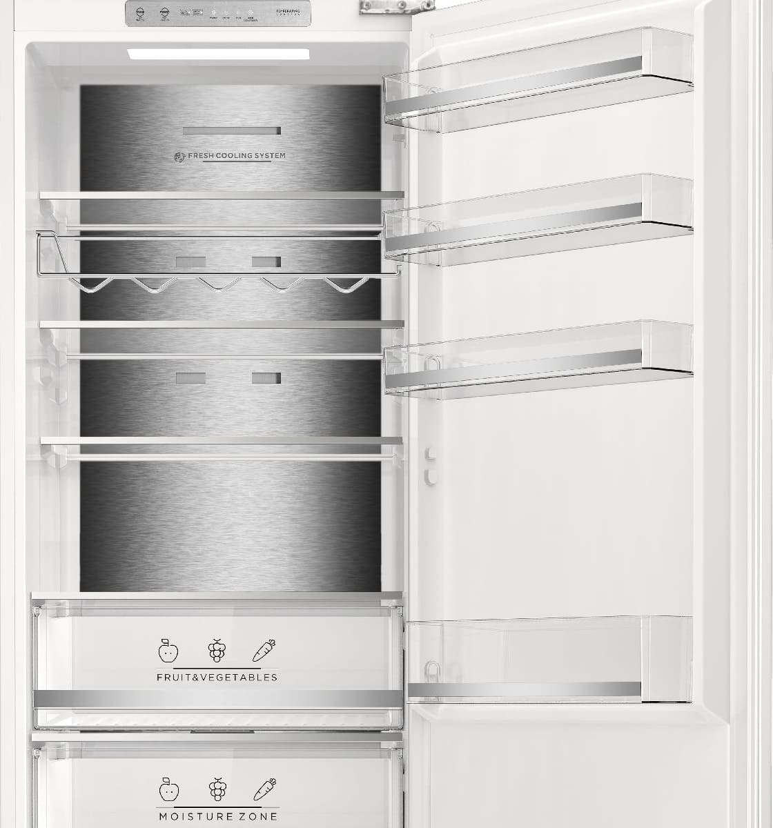 Вместительные контейнеры позволяют хранить достаточное количество овощей и фруктов. Для более длительного хранения и поддержания свежести овощей и фруктов разработаны специальные системы хранения. Среди них, например, зона свежести с увеличенной влажностью до 85% и температурой около 0 градусов. Это герметично закрывающийся ящик, часто на выдвижных роликах или направляющих, в котором имеется специальное задвижка, позволяющая регулировать влажность. Как известно, при более высокой влажности продукты с большим содержанием воды дольше остаются свежими.