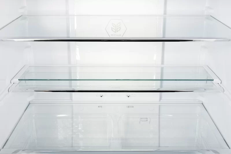 Полки в отделении бывают нескольких типов. Чаще всего встречаются полки из закаленного или ударопрочного стекла. Закаленное стекло выдерживает особенно большие нагрузки до 25 кг, так что на них можно устанавливать посуду из любого материала. Стекло является безопасным нейтральным материалом, не желтеет и не портится со временем, а также быстро и легко моется. Для того чтобы предотвратить проливание жидкости, полки оснащаются металлической или пластиковой окантовкой.