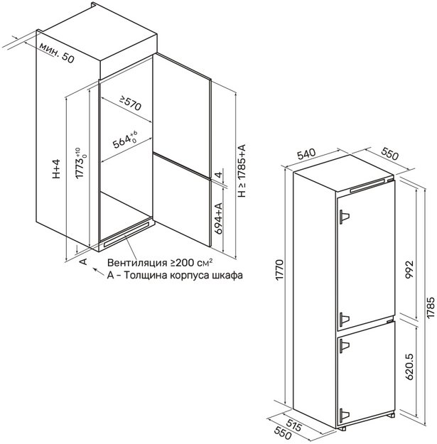 - Габариты ниши для встраивания (ВхШхГ): 196.3х56.4-55х57 см