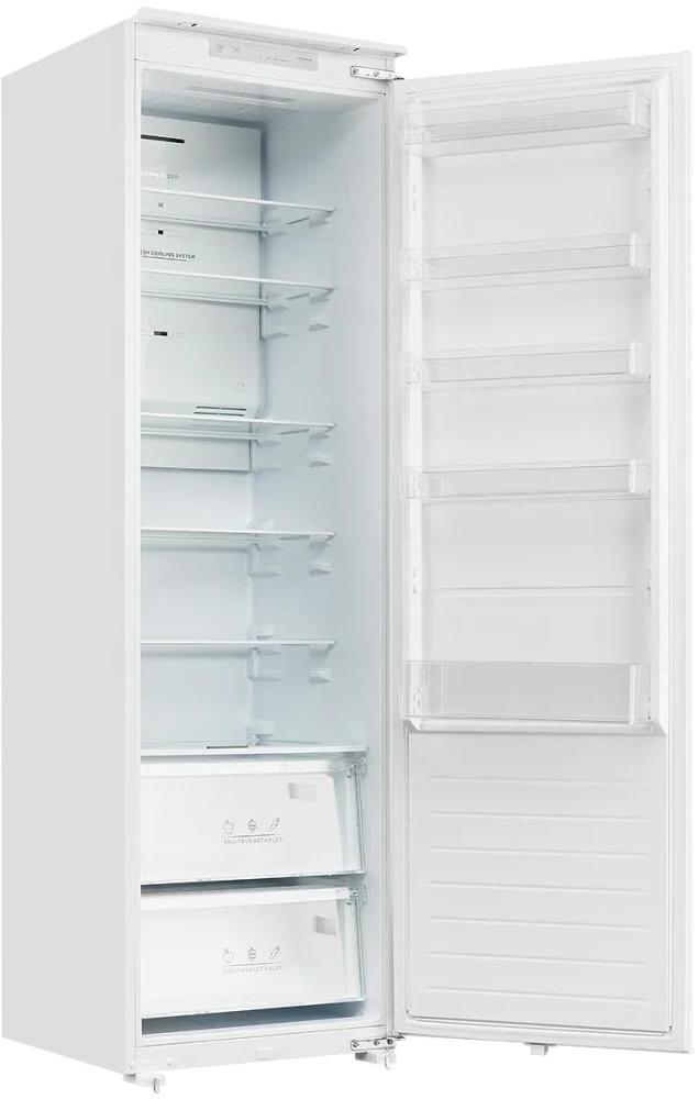 Модель оборудована одной камерой объемом 304 литра, что делает ее достаточно вместительной для хранения большого количества продуктов. Внутреннее пространство организовано с учетом максимального удобства: имеется шесть полок, из которых четыре — регулируемые, а две — фиксированные. Полки выполнены из стекла, что обеспечивает их прочность и долговечность. Для хранения овощей и фруктов предусмотрены два больших ящика. На дверце расположены пять полок из пластика, что позволяет эффективно использовать весь доступный объем.
