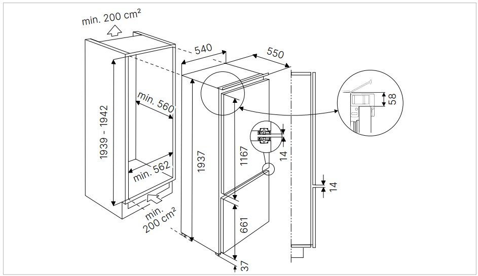 Встраиваемый прибор проще разместить в комнате, даже если общий метраж не такой уж большой. Вы можете спрятать его за декоративной панелью от мебельного фасада — советуем заранее определить нишу и заказывать панели исходя из типа крепления к двери. Способ монтажа в данной модели: жесткое крепление (система door on door) Благодаря внушительным размерам, в частности высоте, она подходит большим пространствам — просторной кухне, еврогостиной. Вы можете поменять направление открывания двери, так как упор переставляемый и ее можно перевесить на другую сторону. Такая функция открывает больше возможностей для установки. Холодильник с морозильником обладает всеми опциями, которые чаще всего ищут и выбирают покупатели. Стандартная конфигурация — универсальный вариант для любой квартиры. Количество камер: 2.
