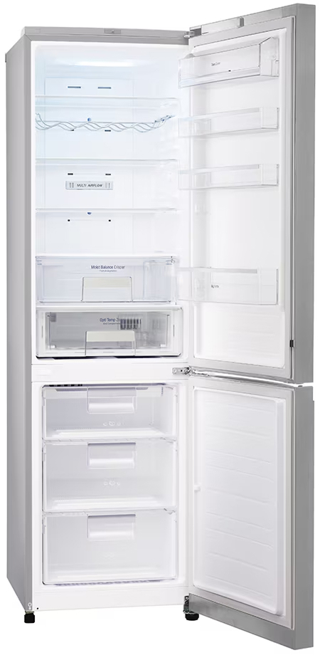 No Frost (Total No Frost, Frost Free): вентилятор обеспечивает циркуляцию охлажденного воздуха, благодаря чему лед не нарастает на стенке, а концентрируется только на скрытом внутри холодильника испарителе. Талая вода собирается в специальной емкости и испаряется. Такой холодильник не нужно размораживать – это экономит время и позволяет не останавливать прибор. Благодаря этим плюсам в современных моделях No Frost – самая распространенная система.