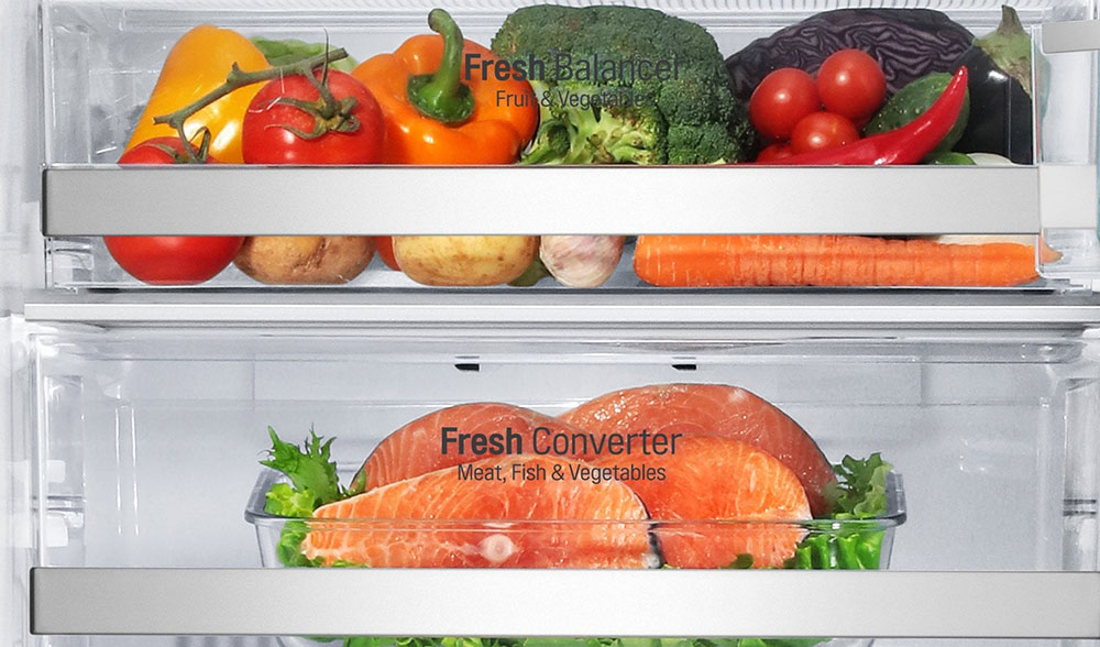 Вместительные контейнеры позволяют хранить достаточное количество овощей и фруктов. Для более длительного хранения и поддержания свежести овощей и фруктов разработаны специальные системы хранения. Среди них, например, зона свежести с увеличенной влажностью до 85% и температурой около 0 градусов. Это герметично закрывающийся ящик, часто на выдвижных роликах или направляющих, в котором имеется специальное задвижка, позволяющая регулировать влажность. Как известно, при более высокой влажности продукты с большим содержанием воды дольше остаются свежими.