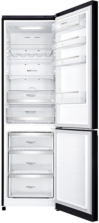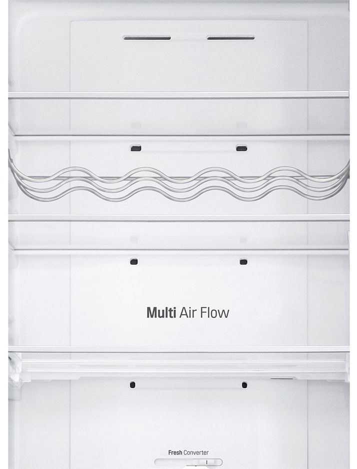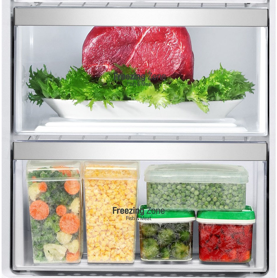 Специальная зона свежести предназначена для правильного и более длительного хранения овощей, фруктов, зелени. В ней поддерживается околонулевая температура, поэтому продукты не перемораживаются и не пересыхают. Система охлаждения этого холодильника — Multi-Airflow-System.