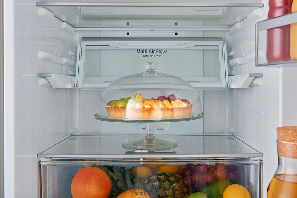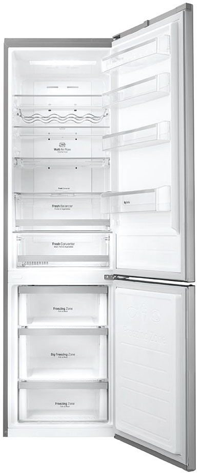 Специальная зона свежести предназначена для правильного и более длительного хранения овощей, фруктов, зелени. В ней поддерживается околонулевая температура, поэтому продукты не перемораживаются и не пересыхают. Система охлаждения этого холодильника — Multi-Airflow-System.