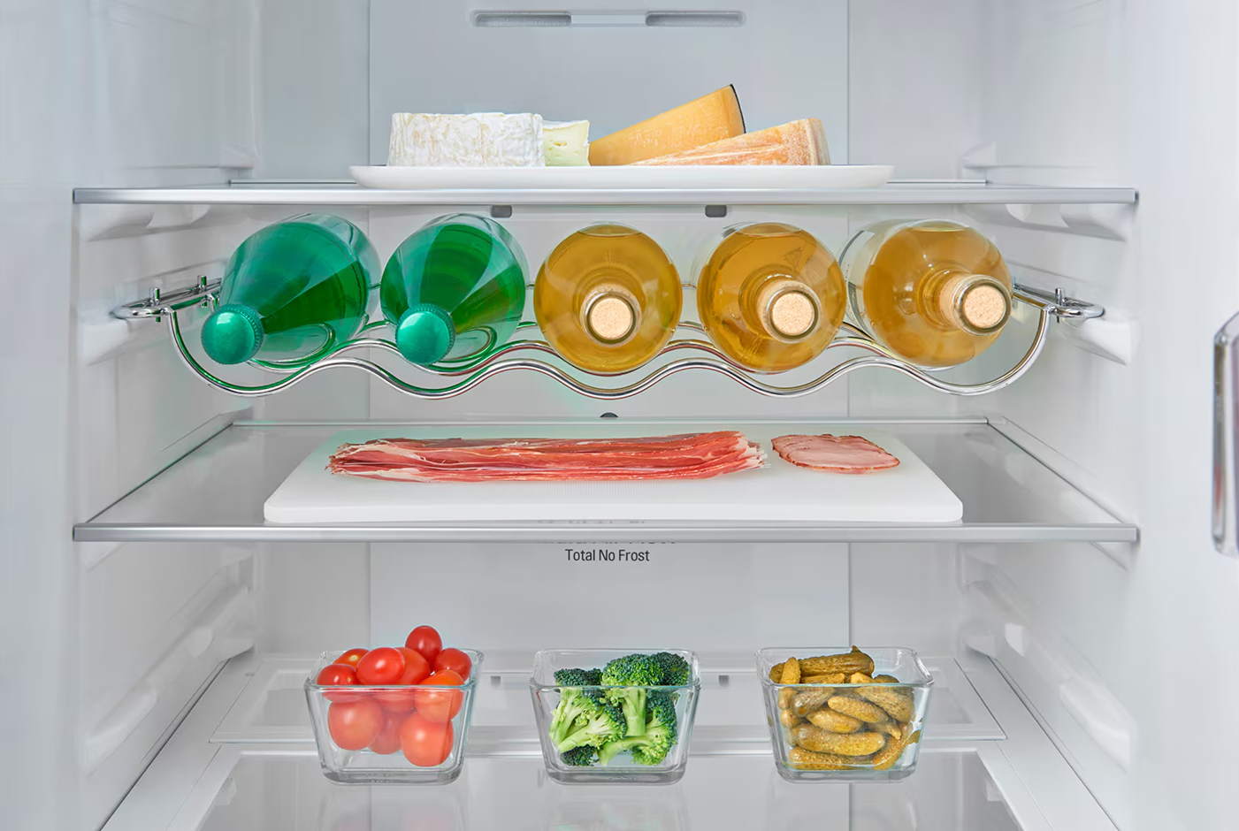 Для стеклянных бутылок, особенно винных и содержащих другие алкогольные напитки, предусматривается размещение на подвесной решетчатой металлической полке. Бутылки на ней располагаются в горизонтальном положении — это оптимальный способ хранения вин. Съемная металлическая полка легко моется под краном.