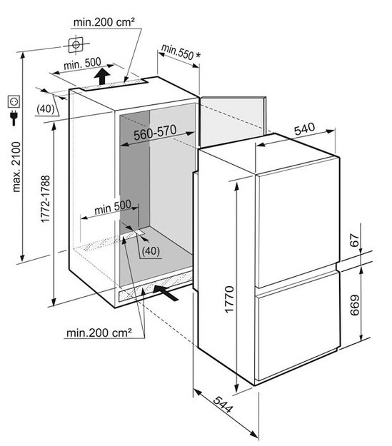 Во встраиваемых моделях имеется специально организованная система вентиляции, не позволяющая им перегреваться при установке в шкаф-пенал или нишу. Нередко в них имеется вентиляционная база с решеткой в цоколе: она выдерживает достаточные нагрузки и позволяет обеспечить необходимый уровень вентиляции. Системы внутренней вентиляции призваны равномерно распределять охлажденный воздух по всему объему камеры и поддерживать естественную влажность. Для моделей с системой размораживания No Frost предусмотрена принудительная вентиляция, которая предусматривает движение воздуха через испаритель.