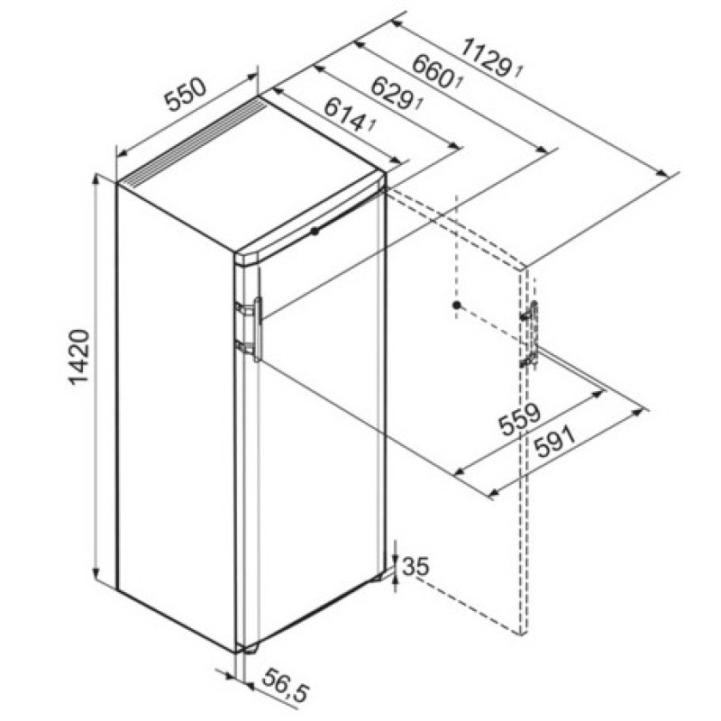 Liebherr Ksl 2814 Comfort — компактная отдельно стоящая модель высотой 140 см и шириной 55 см в стальном корпусе серебристого цвета. Устройство с одной дверцей и верхним расположением морозильной камеры подойдет для небольшой кухни, студии или дачи. Для удобства установки дверцу можно перенавешивать. Общий объем составляет 263 литра. Несмотря на небольшие размеры, морозильник объемом 22 литра имеет четырехзвездочное обозначение — в нем могут поддерживаться низкие температуры до −24 °C.