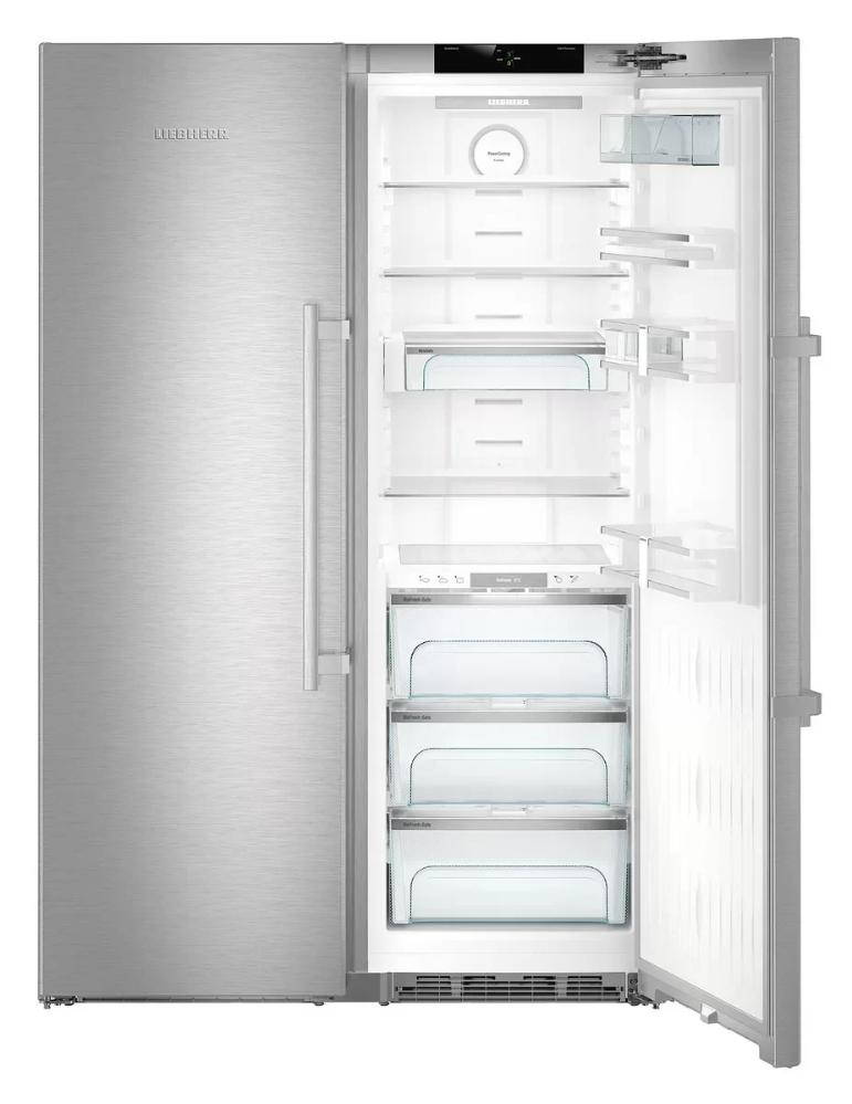 Liebherr SBSes 8773 — холодильник Side-by-side объемом 635 л. Имеет сенсорное управление и 2,4-дюймовый сенсорный цветной TFT-дисплей, где отображаются индикаторы температуры во всех отделениях. В зоне свежести BioFresh поддерживается оптимальная температура для долгого хранения овощей, фруктов, мяса и рыбы. На покрытии SmartSteel не остается отпечатков пальцев и царапин.