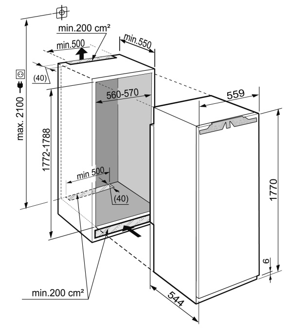 Во встраиваемых моделях имеется специально организованная система вентиляции, не позволяющая им перегреваться при установке в шкаф-пенал или нишу. Нередко в них имеется вентиляционная база с решеткой в цоколе: она выдерживает достаточные нагрузки и позволяет обеспечить необходимый уровень вентиляции. Системы внутренней вентиляции призваны равномерно распределять охлажденный воздух по всему объему камеры и поддерживать естественную влажность. Для моделей с системой размораживания No Frost предусмотрена принудительная вентиляция, которая предусматривает движение воздуха через испаритель.