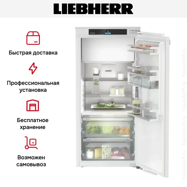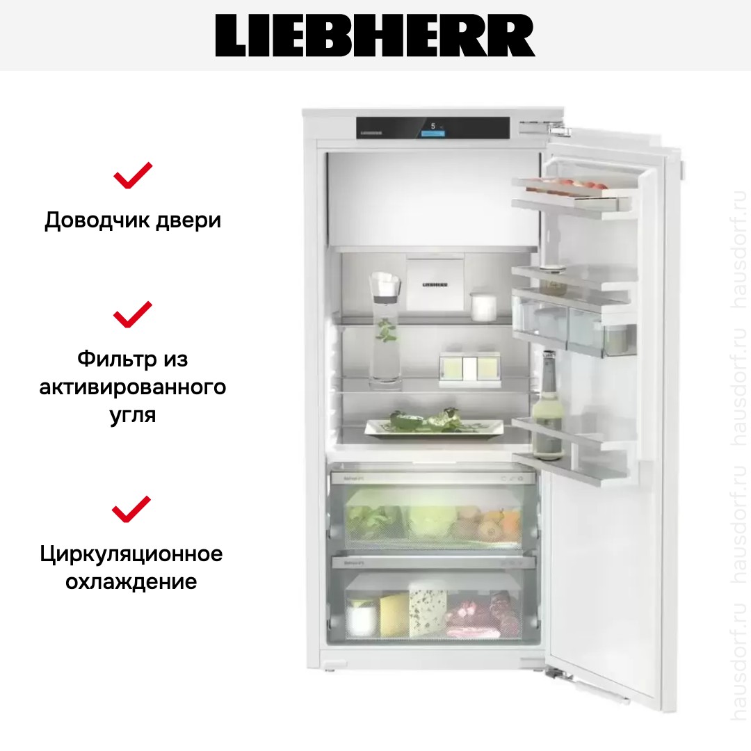 Встраиваемый холодильник Liebherr IRBd 4151 Prime удобен и вместителен. Морозильная камера расположена сверху. Контейнеры BioFResh находятся внизу камеры, температура в них близка к 0 градусам, а влажность повышена, благодаря чему овощи и фрукты дольше остаются свежими. Вы можете не упаковывать продукты, хранящиеся подобным образом, контейнер закрывается плотно.